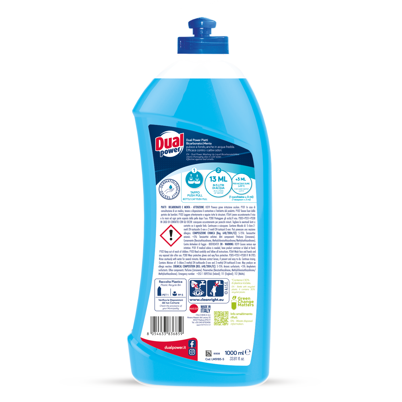 Dermatologically tested, Dual Power Bicarbonate of Soda and Mint Washing Up Liquid is formulated to ensure maximum effectiveness against food residue: it’s the ideal choice for sparkling-clean, spotless dishes.