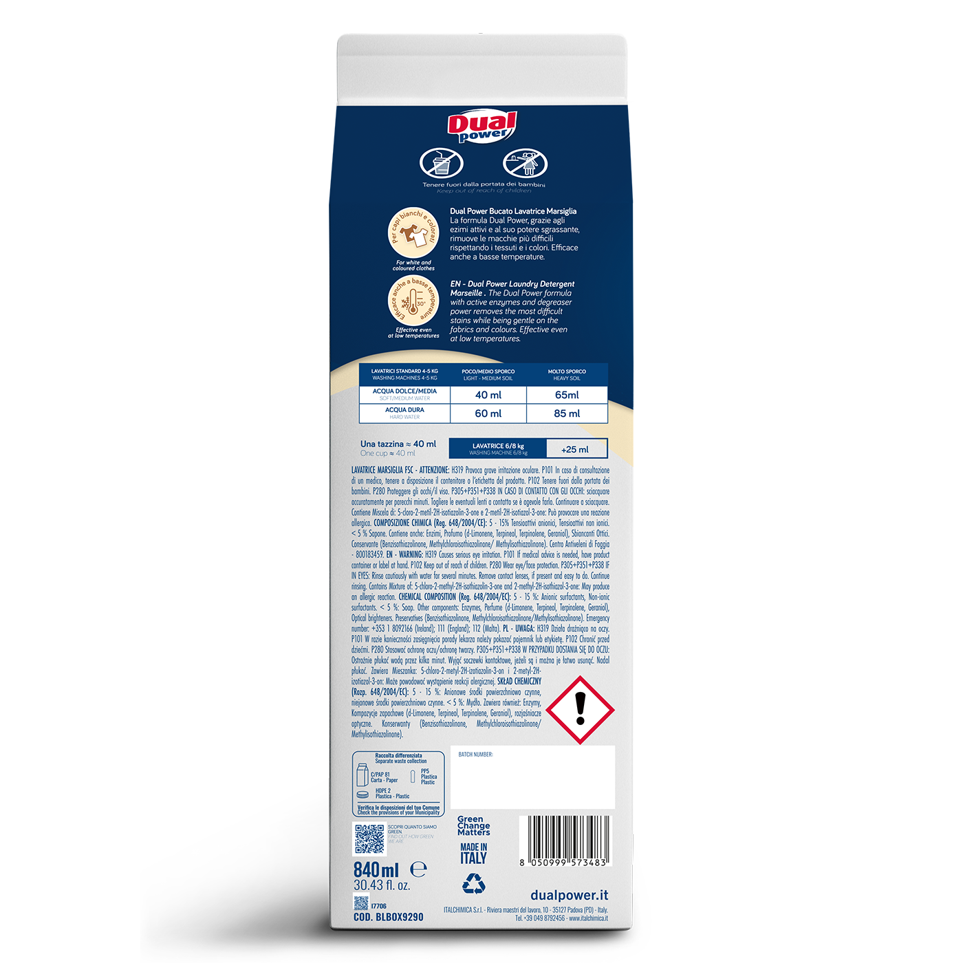 *Il flacone infatti è certificato Aticelca (che ne attesta la riciclabilità), è in materiale a prevalenza cellulosica e permette una riduzione della plastica fino all’83% (rispetto al Formato Dual Power Bucato 1,8L). Non solo, l’imballo è certificato FSC – Forest Stewardship Council – per la gestione responsabile delle foreste nel mondo.